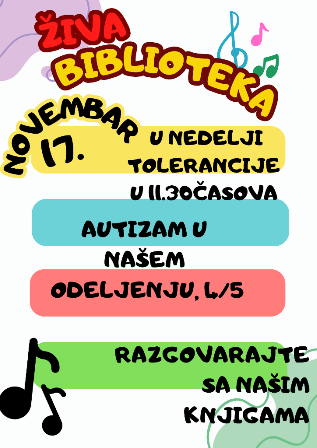 Ми смо данас, 17. Новембра 2023. године, у завршној активности у Недељи толеранције реализовали ЖИВУ БИБЛИОТЕКУ. Дали смо прилику одељењу 45 , деци и учитељици да причају о својим искуствима заједничког учења, дружења и одрастања заједно са другаром који има аутизам. Своја искуства школовања детета са аутизмом је поделила са посетиоцима ЖИВЕ БИБЛИОТЕКЕ и породица детета, лични пратилац, стручни сарадници.